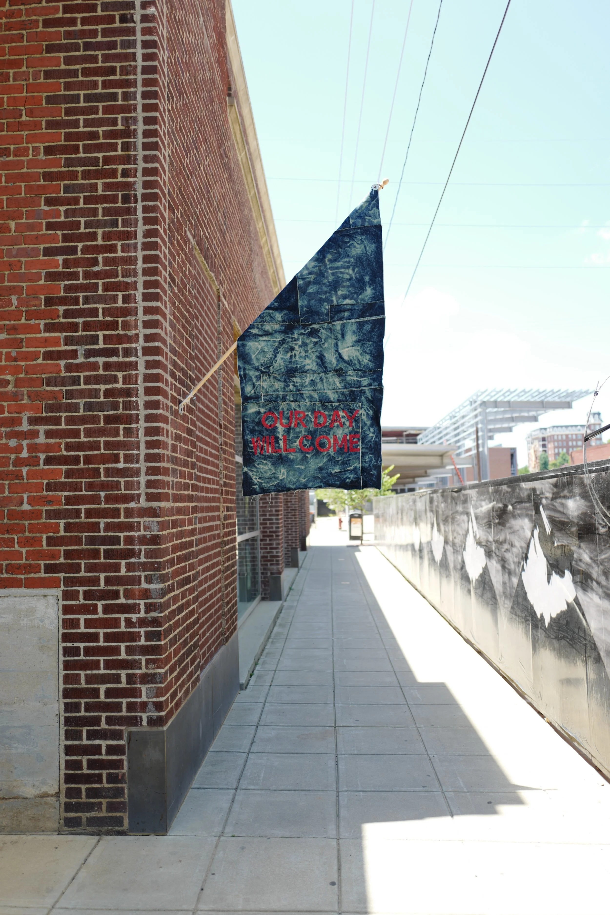 This work was created specifically for CAM Raleigh, a Contemporary Art Museum in Raleigh, USA. It is one of the many collaborations between Victor Lytvinenko, founder of fashion brand Raleigh Denim. The work was created in the Raleigh Denim factory in downtown Raleigh, a block away from the museum and is made from American-made denim, bleach and acrylic paint, with a phrase hand painted by Phil America.
